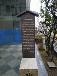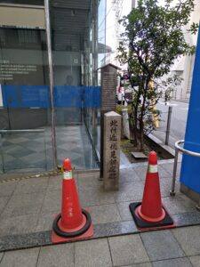 銀行の角に立つ石碑