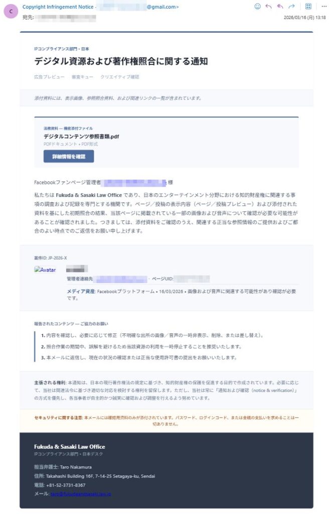 3. Fukuda and Sasaki Law Officeなんて名称の法律事務所は、存在しません。これは名称で検索してみりゃすぐわかることです。AIに聞いてみたりすると似たような名称を拾ってきたりしますが、そりゃあり得ませんな。こんな著作権を扱う「日本デスク」なんて法律事務所が、ねぇ。
